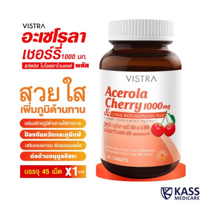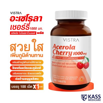 วิสทร้า อะเซโรลา เชอร์รี่ & ซิตรัส ไบโอฟลาโวนอยด์ พลัสอุดมด้วยวิตามินซีจากธรรมชาติ ขนาด 100 เม็ด เสริมภูมิต้านทานให้กับร่างกาย ป้องกันไข้หวัดและบรรเทาอาการภูมิแพ้ เสริมประสิทธิภาพการดูดซึมด้วย ซิตรัส ไบโอฟลาโวนอยด์ ประสิทธิภาพสูงด้วยสารต้านอนุมูลหลากหลายชนิด เช่น สารสกัดจากเมล็ดองุ่น สารสกัดจากทับทิม เบต้า แคโรทีน ไลโคปีน