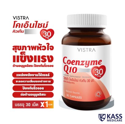 ของเเท้ 100% VISTRA Coenzyme Q10 30 mg (30 CAPSULES) วิสทร้า โคเอนไซม์ คิวเท็น 30 มก. ชะลอริ้วรอยก่อนวัย เสริมสร้างระบบภูมิคุ้มกัน เพื่อหัวใจที่แข็งแรง และ ทุกส่วนของร่างกาย เป็นแหล่งพลังงานให้กล้ามเนื้อหัวใจ เติมเต็มพลังงานสำหรับเซลล์สมอง เพิ่มพลังงานให้เซลล์ผิวพร้อมปกป้องริ้วรอย มีส่วนช่วยในการต่อต้านอนุมูลอิสระ