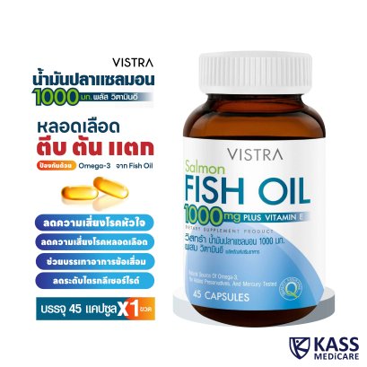 ของเเท้ 100% VISTRA Salmon FISH OIL 1000mg PLUS VITAMIN E (45 CAPSULES) DIETARY SUPPLEMENT PRODUCT วิสทร้า น้ำมันปลาแซลมอน 1000 มก. ผสมวิตามินอี ผลิตภัณฑ์เสริมอาหาร น้ำหนักสุทธิ 65.66 กรับ (45 แคปซูล) เพื่อสุขภาพหัวใจและหลอดเลือด ให้อีพีเอ 180 มก. และดีเอซเอ 120 มีส่วนช่วยลดความเสี่ยงของโรคหัวใจและหลอดเลือด ควบคุมระดับไตรกลีเซอไรด์ และโคเลสเตอรอลให้อยู่ในระดับ มาตตรฐาน มีส่วนช่วยบรรเทาอาการปวดจากโรคที่เกี่ยวกับข้อ มีส่วนช่วยส่งเสริมการทำงานของสมอง