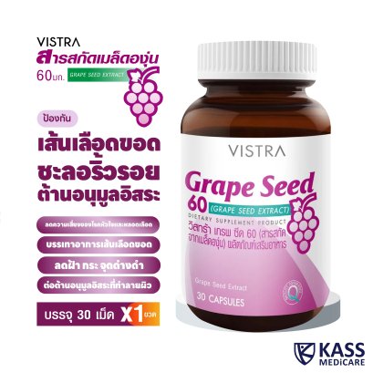 ราคาพิเศษเมื่อซื้อเเพ็คคู่ 2 ขวด VISTRA Grape Seed 60mg NATURAL EXTRACT 30 CAPSULES วิสทร้า เกรพ ซีด 60 (สารสกัดจากเมล็ดองุ่น) ผลิตภัณฑ์เสริมอาหารน้ำหนักสุทธิ 15 g (30 แคปซูล) สารต้านอนุมูลอิสระประสิทธิภาพสูง ส่งเสริมการไหลเวียนของโลหิต ลดความเสี่ยงของโรคหัวใจและหลอดเลือด บรรเทาอาการเส้นเลือดขอด ลดความเสี่ยงของโรคต่าง ๆ ที่มีสาเหตุจากอนุมูลอิสระ