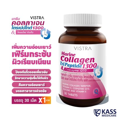 ของเเท้ 100% ราคาสุดคุ้ม เมื่อซื้อเเพ็คคู่ 2 ขวด VISTRA VISTRA Marine TriPeptide 1300 & COENZYME Q10 PLUS DIETARY SUPPLEMENT PRODUCT วิสทร้า มารีน คอลลาเจน ไตรเปปไทด์ 1300 แอนด์ โคเอนไซม์ คิวเท็น พลัส แลิตกัณฑ์เสริมอาหาร น้ำหนักสุทธิ 46.5 กรัม (30 TABLETS) เติมคอลลาเจนให้ผิวชุ่มชื้น แลดูอ่อนเยาว์ มีปริมาณคอลลาเจน ไตรเปปไทด์ 1,300 มก./เม็ด คอลลาเจนที่มีโมเลกุลขนาดเล็กมากและสม่ำเสมอทำให้ดูดซึมและนำไปใช้ได้อย่างรวดเร็ว ป้องกันปัญหาริ้วรอยร่องลึก และช่วยกักเก็บความชุ่มชื้นให้กับผิว ไกลซีนที่เป็นกรดอะมิโนหลักในการสร้างคอลลาเจน วิตามินซี มีส่วนช่วยในกระบวนการเสริมสร้างคอลลาเจน เสริมโคเอ็นไซม์คิวเท็น เพื่อช่วยต่อต้านอนุมูลอิสระที่มาทำร้ายผิว