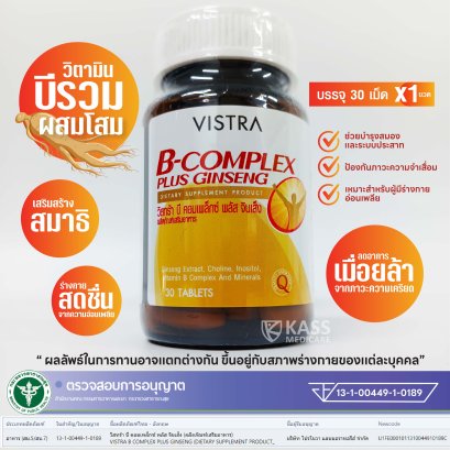 VISTRA B-COMPLEX PLUS GINSENG (30 Tablets) DIETARY SUPPLEMENT PRODUCT วิสทร้า บีคอมเพล็กซ์ พลัส จินเส็ง ผลิตภัณฑ์อาหารเสริม น้ำหนักสุทธิ 42 กรัม (30 แคปซูล) "เพิ่มพลัง คลายเครียดด้วยจินเซนโนไซด์ (Ginsenoside)" - ครบถ้วนด้วยวิตามินมีรวมทุกชนิด - ผสมโสมเพื่อประโยชน์ที่เข้มข้นขึ้น - เพิ่มความสดชื่น เสริมสร้างสมาธิ และความทนทาน - ลดอาการเมื่อยล้าจากภาวะเครียดหรือการออกกำลังกาย