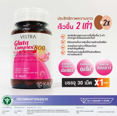 วิสทร้า กลูตาคอมเพล็กซ์ 800 พลัส สารสกัดจากข้าว ผลิตภัณฑ์เสริมอาหาร น้ำหนักสุทธิ 42 กรัม (30 เม็ด) "The Brilliant White Perfection" - ประสิทธิภาพความขาวเร็วขึ้นเป็น 2 เท่า จากกลูตาไธโอนและเซราไมด์ - มีส่วนช่วยในการยับยั้งการสร้างเม็ดสีผิวดำ - สารสกัดจากข้าว ที่ให้เซราไมด์ สารสำคัญเพื่อผิว - กักเก็บความชุ่มชื้นให้กับผิวเพื่อคงความอ่อนเยาว์