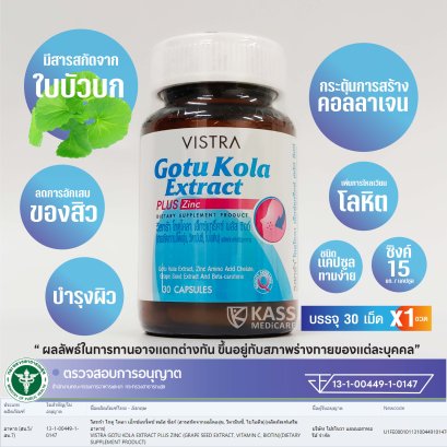 VISTRA Gotu Kola Extract PLUS Zinc (30 CAPSULES) DIETARY SUPPLEMENT PRODUCT วิสทร้า โกตูโคลา เอ็กซ์แทร็คซ์ พลัส ซิงก์ (สารสกัดจากเมล็ดองุ่น, วิตามินซี, ไบโอติน) ผลิตภัณฑ์อาหารเสริม น้ำหนักสุทธิ 16.5 กรัม (30 แคปซูล) "เคลียร์ปัญหาสิว เคลียร์ปัญหาผิว" - สารสกัดจากใบบัวบก บรรเทาอาการอักเสบของสิว - ลดรอยแดงและรอยแผลเป็นของสิว - ให้ซิงค์ 15 มิลลิกรัมต่อแคปซูล - อุดมด้วยสารอาหารเพื่อผิวหลากหลายชนิด - ควบคุมทุกสาเหตุของการเกิดสิว