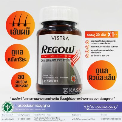 VISTRA REGOW (30 CAPSULES) DIETARY SUPPLEMENT PRODUCT วิสทร้า รีโกว์ ผลิตภัณฑ์อาหารเสริม น้ำหนักสุทธิ 46.5 กรัม (30 แคปซูล) "เพื่อสุขภาพผม ผิว เล็บ ที่แข็งแรง" - Flaxseed และ Horsetail อุดมด้วย โอเมก้า 3,6,9 - ช่วยบำรุงให้เส้นผมมีสุขภาพดี เงางาม รากผมแข็งแรง - ลดภาวะผมบาง ผมร่วง ผมหงอก - ลดการอักเสบของหนังศีรษะ หรือผิวหนัง - ลดเล็บเปราะ แตก บาง