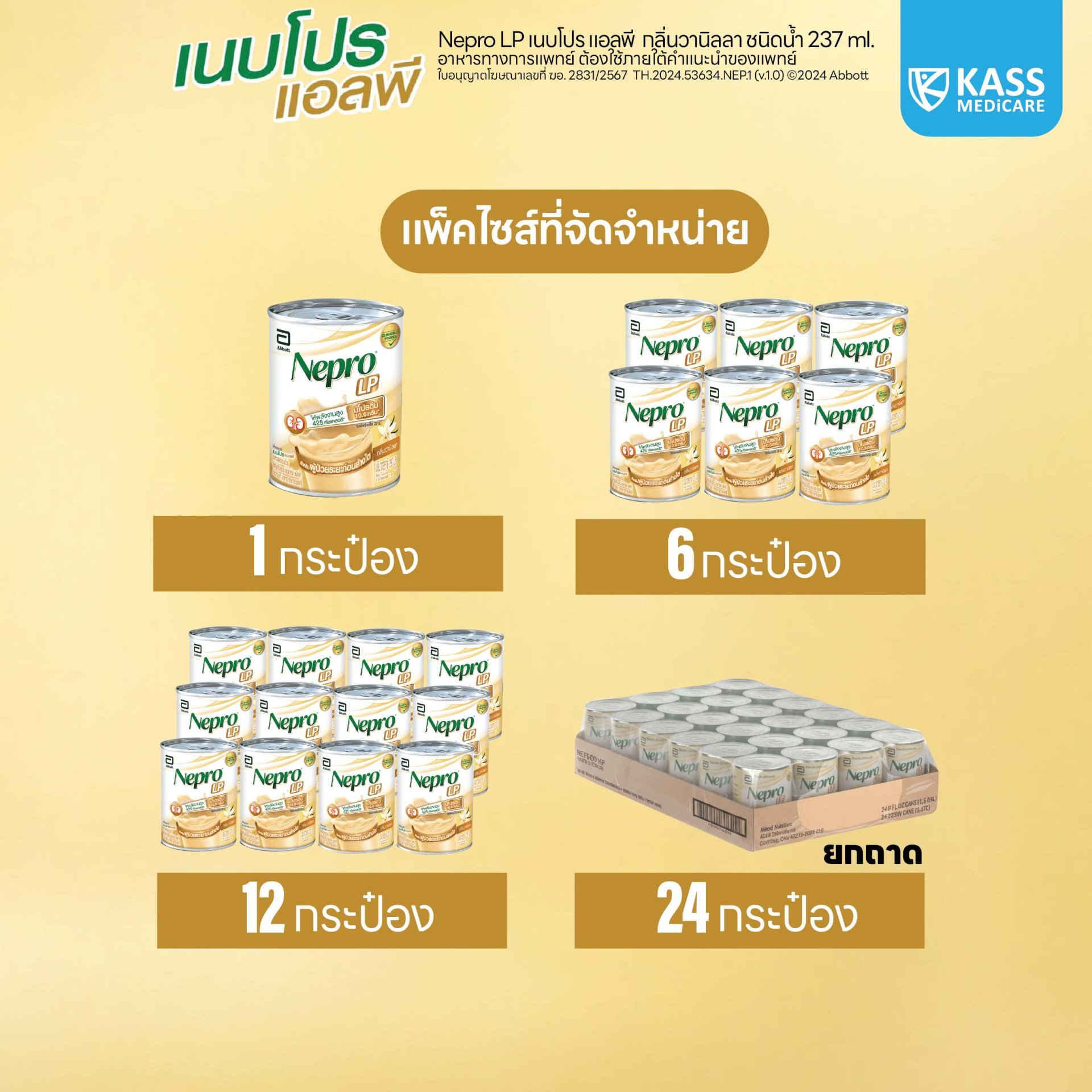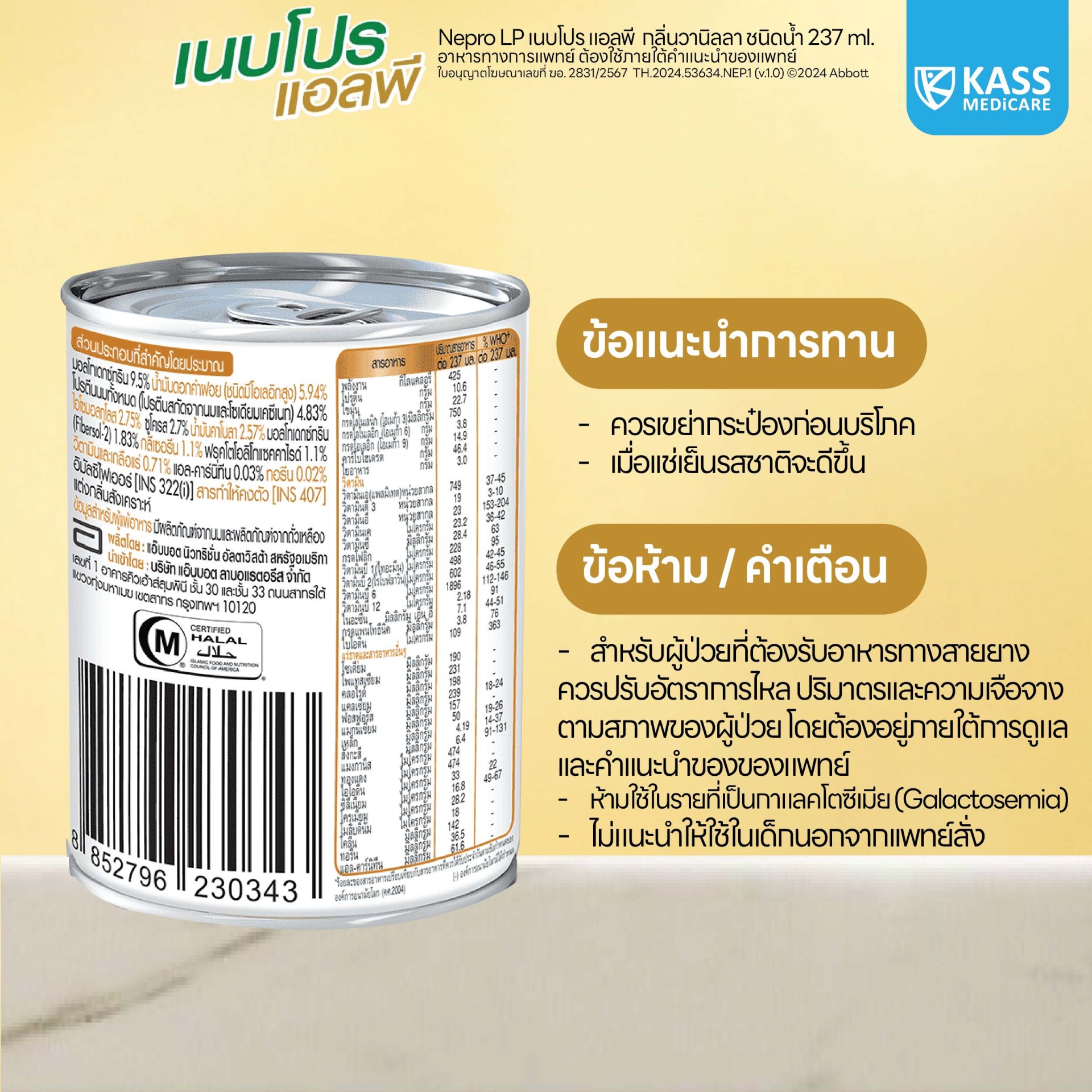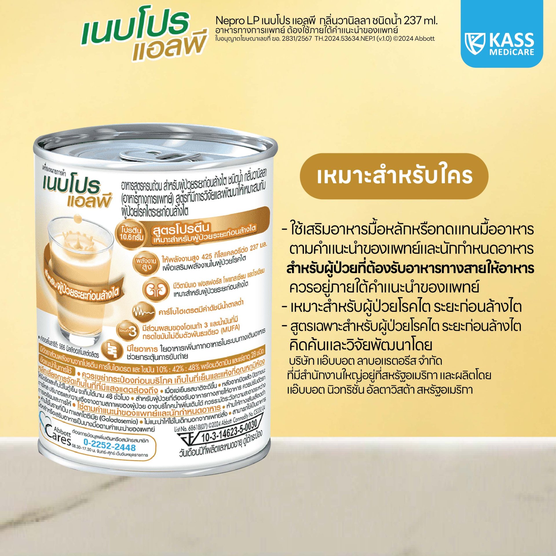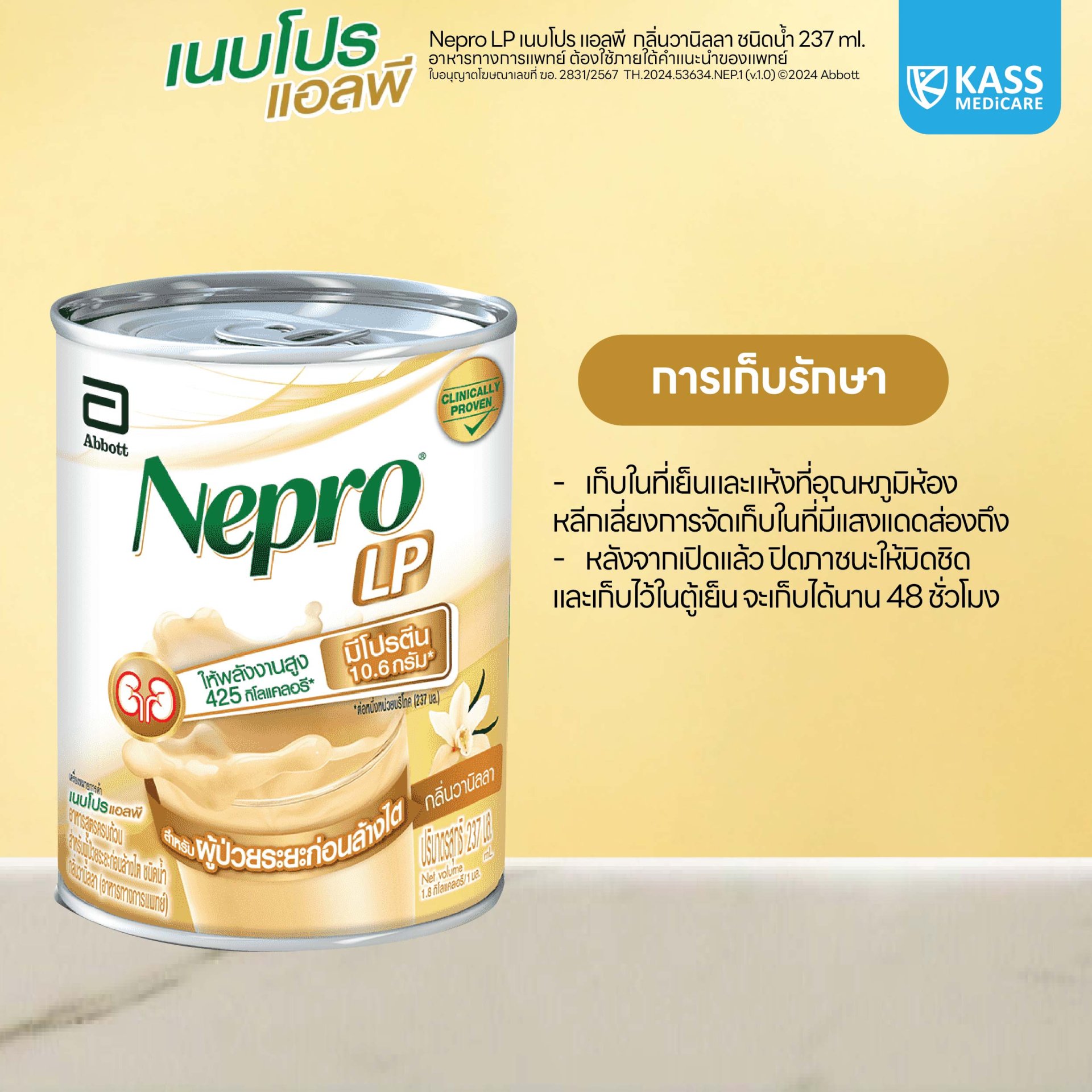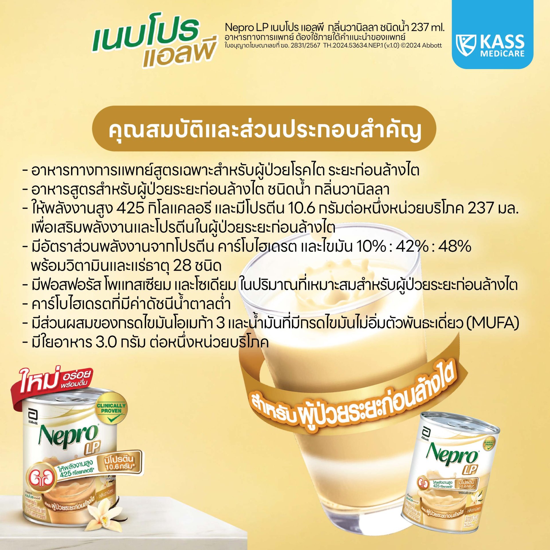 Nepro LP เนบโปร แอลพี กลิ่นวานิลลา ชนิดน้ำ 237 มิลลิลิตร อาหารทางการแพทย์สูตรเฉพาะสำหรับผู้ป่วยโรคไต ระยะก่อนล้างไต