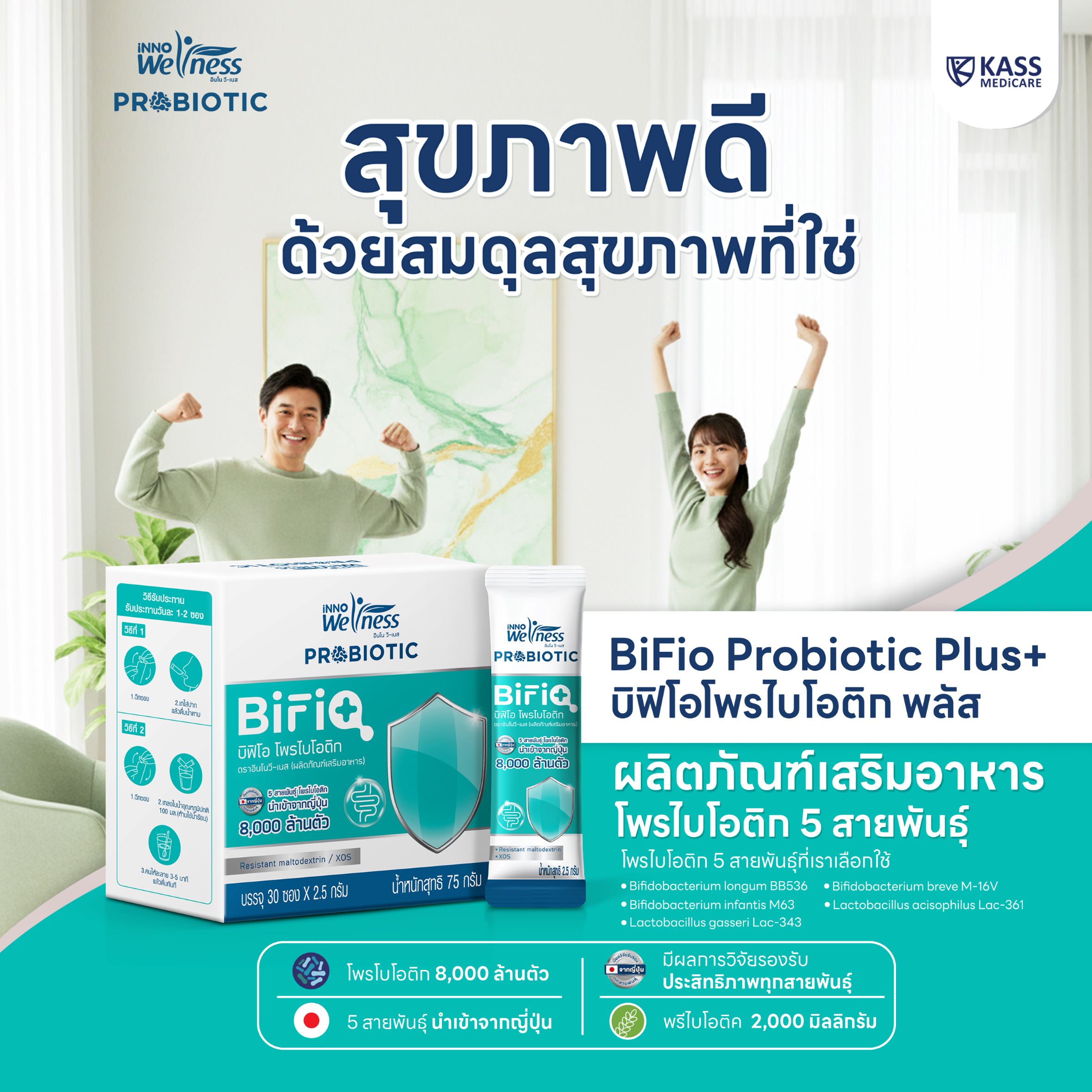 BiFio Probiotic Plus+ (บิฟิโอ โปรไบโอติกพลัส) ผลิตภัณฑ์เสริมอาหาร โปรไบโอติก 5 สายพันธุ์ที่เราเลือกใช้เหมาะสำหรับ/คุณสมบัติ - ช่วยปรับภูมิคุ้มกันและระบบขับถ่าย - ใช้สายพันธุ์ที่เหมาะสมกับคนเอเชีย - ใช้สายพันธุ์ที่ได้รับมาตรฐานจากญี่ปุ่น - มี Prebiotic ส่งเสริมการทำงานให้ Probiotic