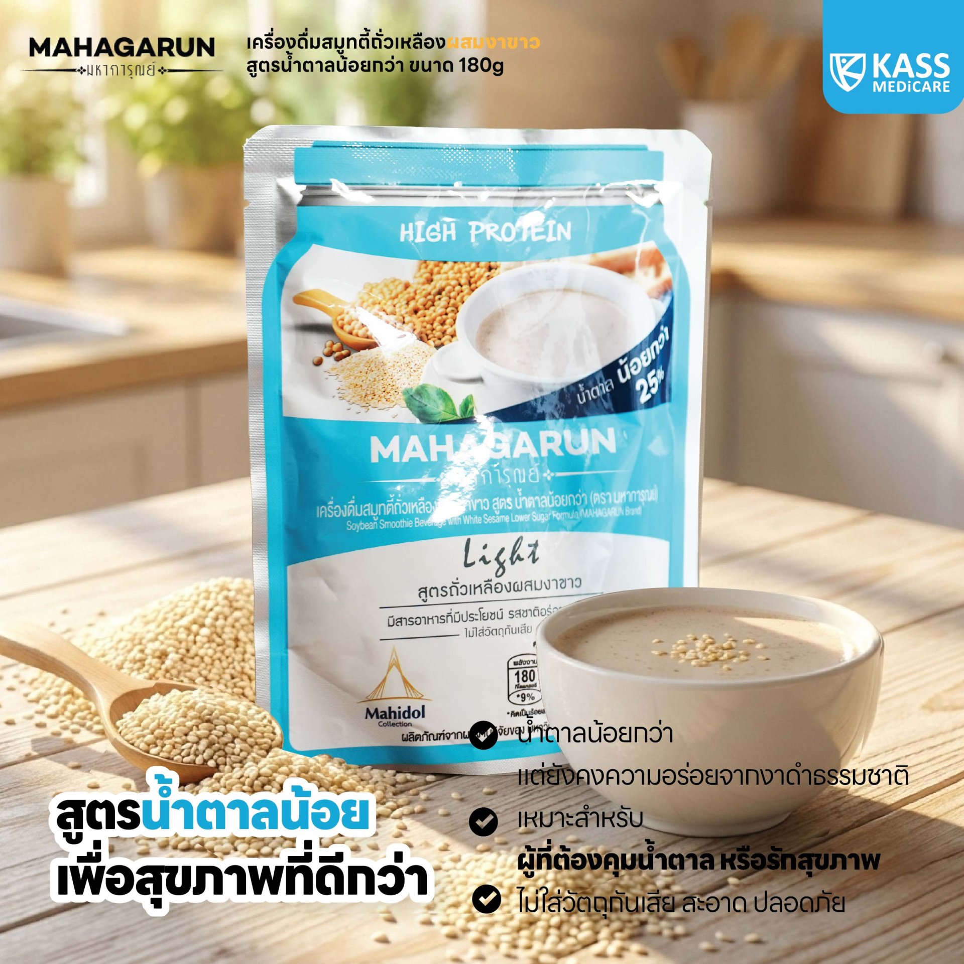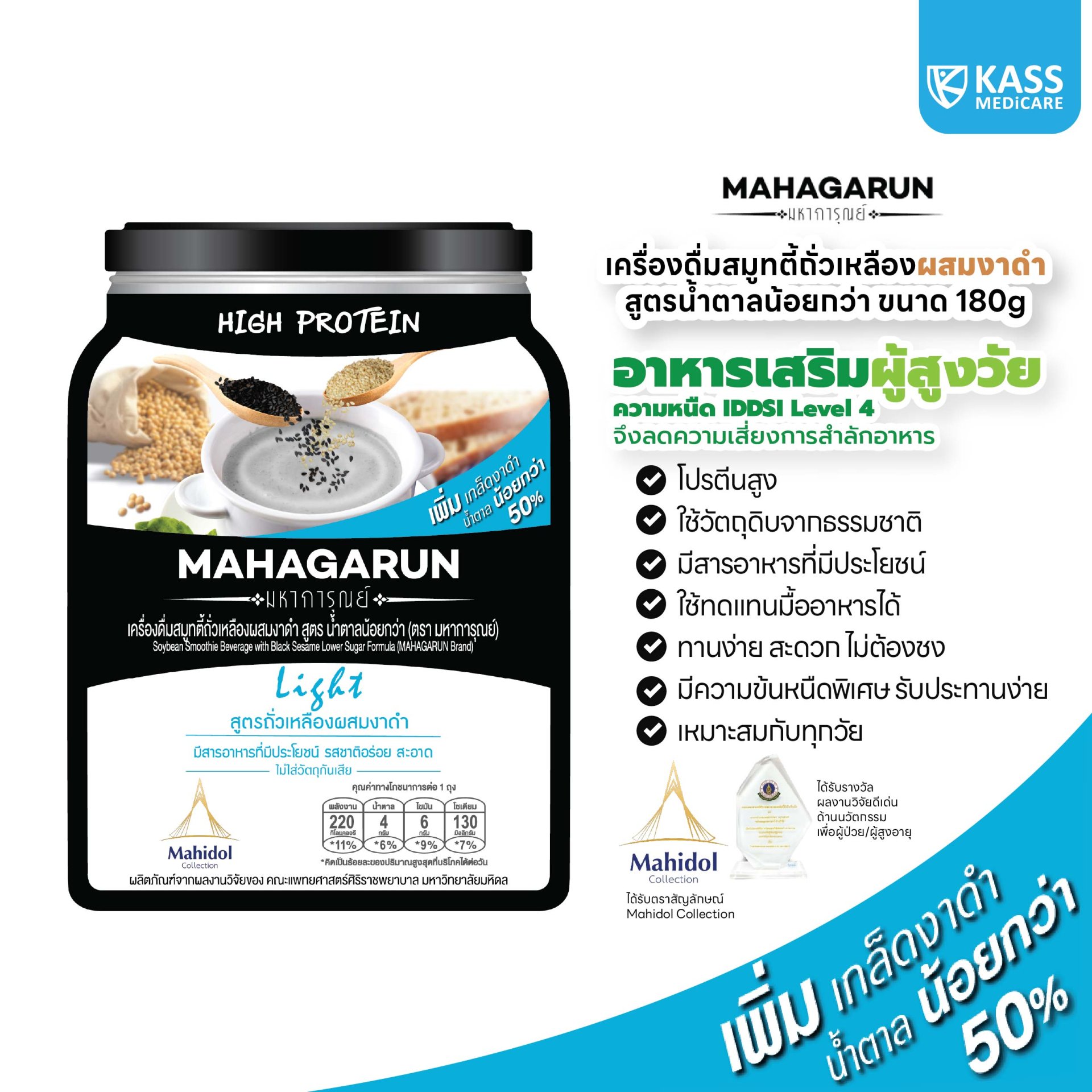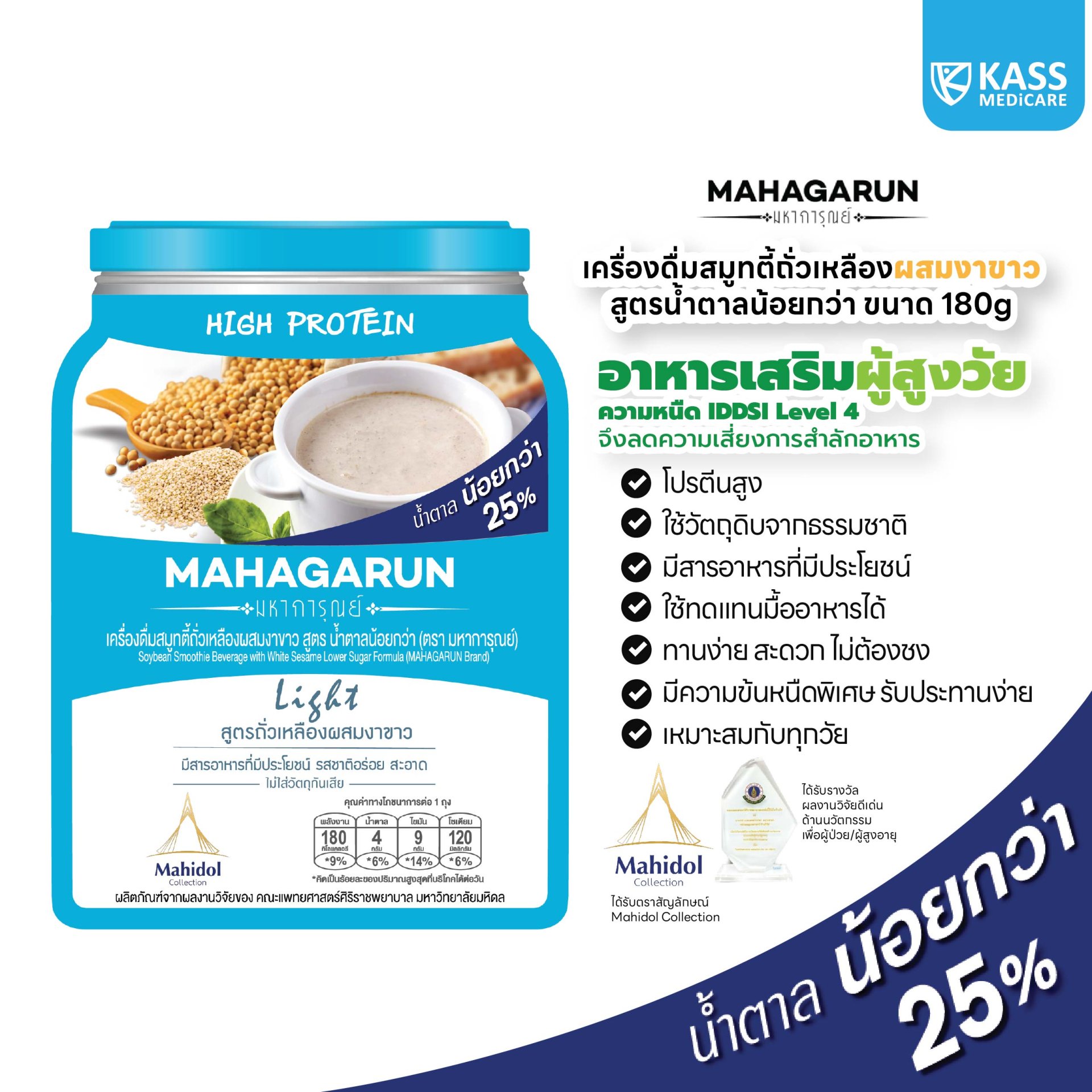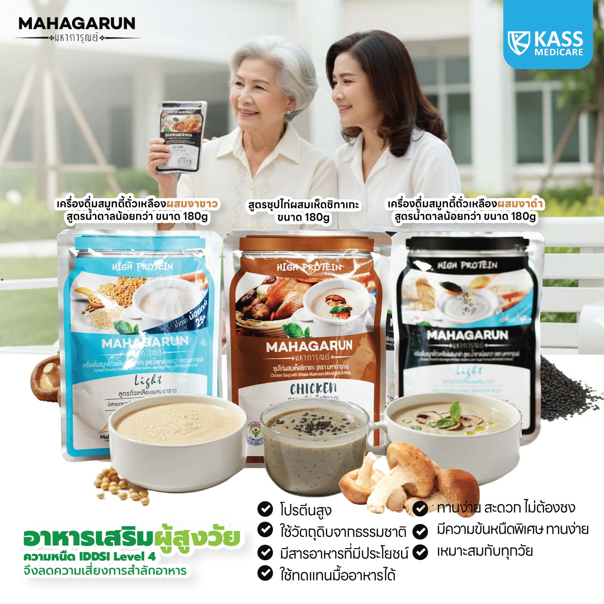 “มหาการุณย์” สมูทตี้พร้อมรับประทาน อร่อยง่าย ไม่ต้องชง (ไม่ใส่วัตถุกันเสีย) น้ำตาลน้อยกว่า ผ่านการวิจัยจากทีมนักวิจัย คณะแพทย์ มหาวิทยาลัยมหิดล เพื่อเสริมคุณค่าทางสารอาหาร โดยเฉพาะผู้สูงวัย และผู้ที่รับประทานอาหารได้ไม่เพียงพอ ในรูปแบบเครื่องดื่มที่มีความข้นหนืดพิเศษ รับประทานง่าย เหมาะสมกับทุกวัย