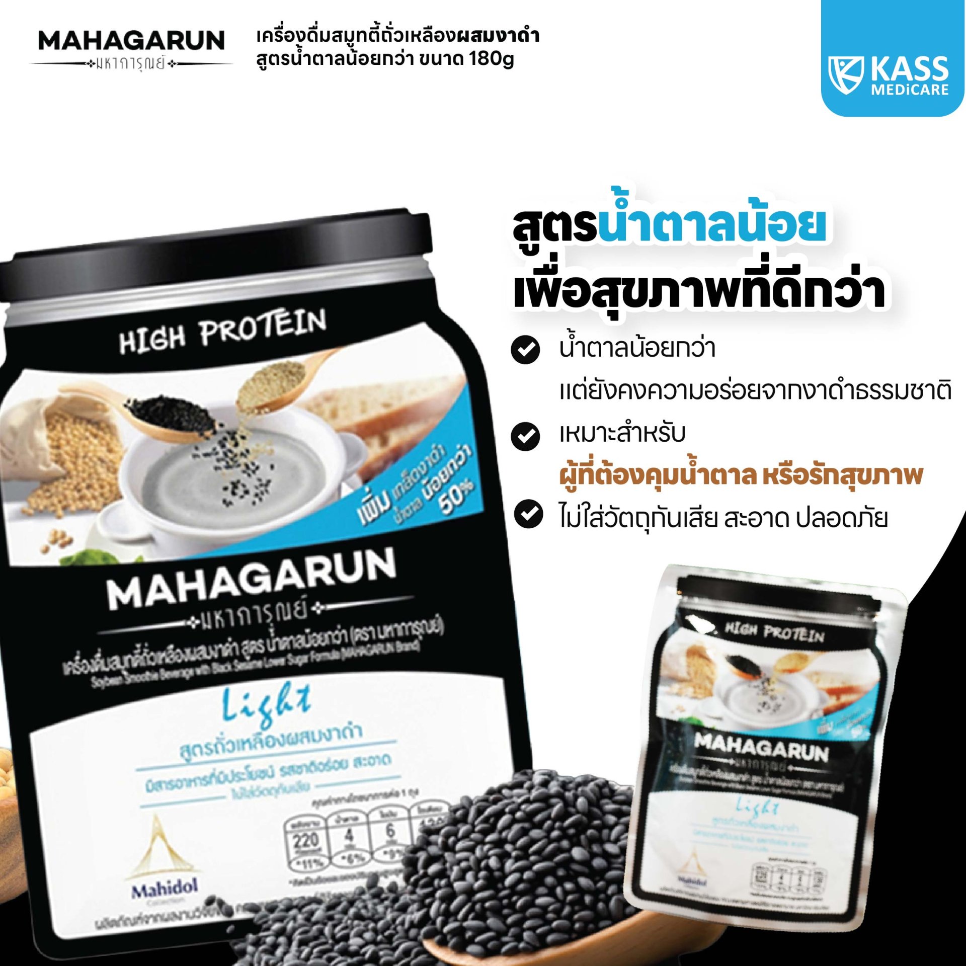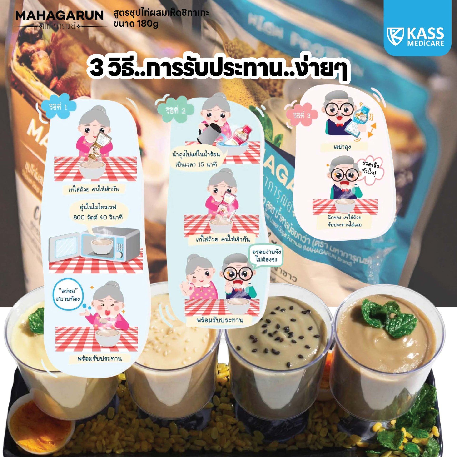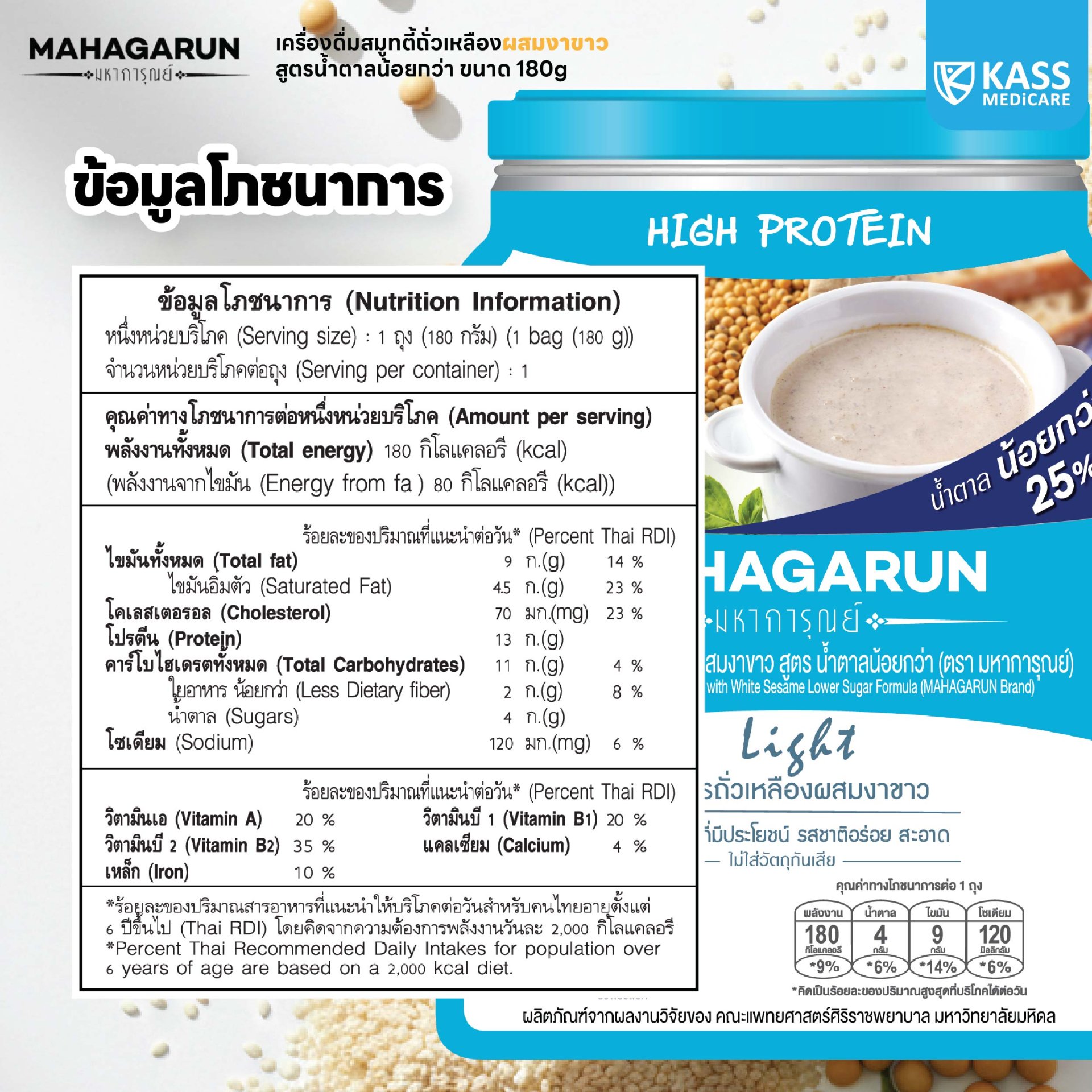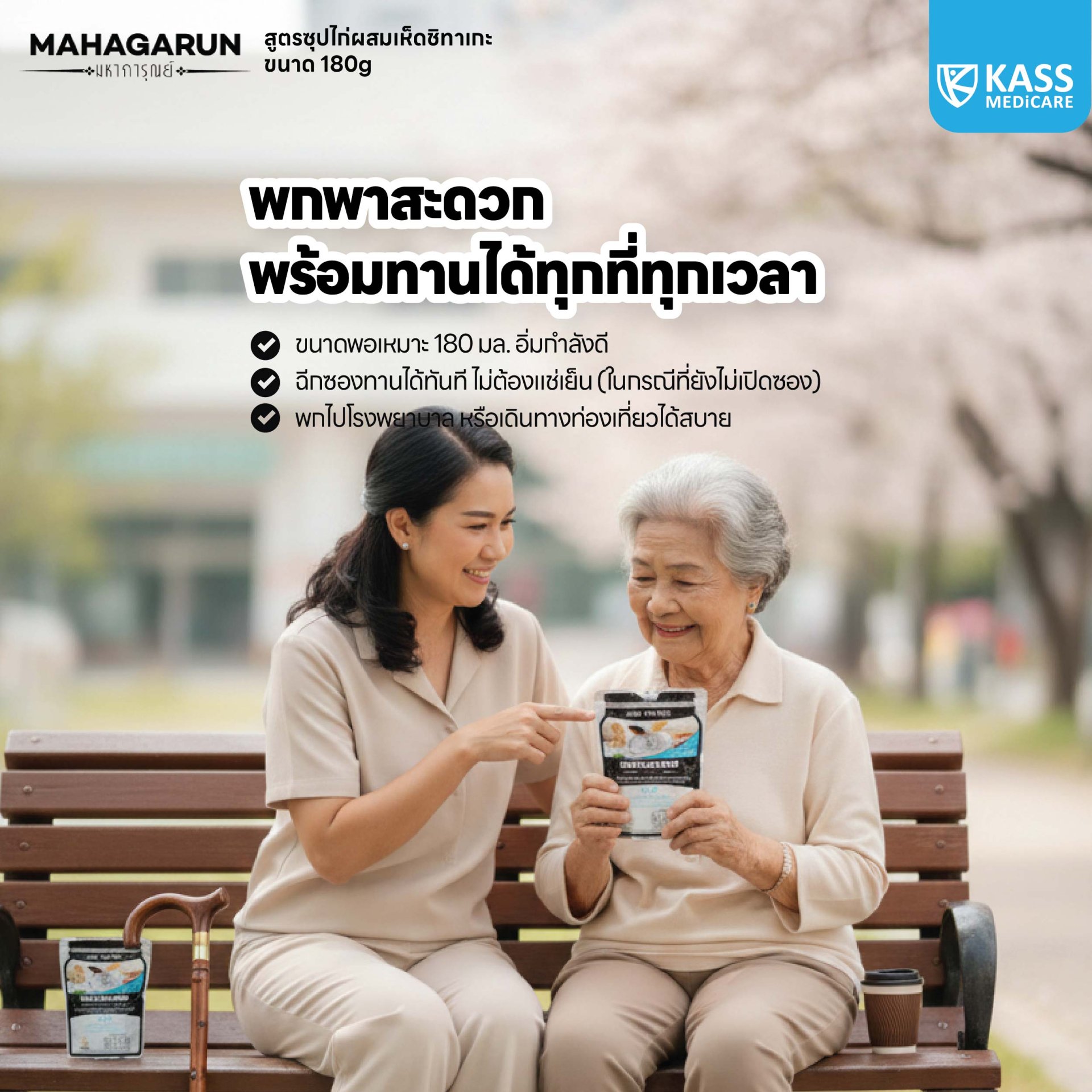 “มหาการุณย์” สมูทตี้พร้อมรับประทาน อร่อยง่าย ไม่ต้องชง (ไม่ใส่วัตถุกันเสีย) น้ำตาลน้อยกว่า ผ่านการวิจัยจากทีมนักวิจัย คณะแพทย์ มหาวิทยาลัยมหิดล เพื่อเสริมคุณค่าทางสารอาหาร โดยเฉพาะผู้สูงวัย และผู้ที่รับประทานอาหารได้ไม่เพียงพอ ในรูปแบบเครื่องดื่มที่มีความข้นหนืดพิเศษ รับประทานง่าย เหมาะสมกับทุกวัย