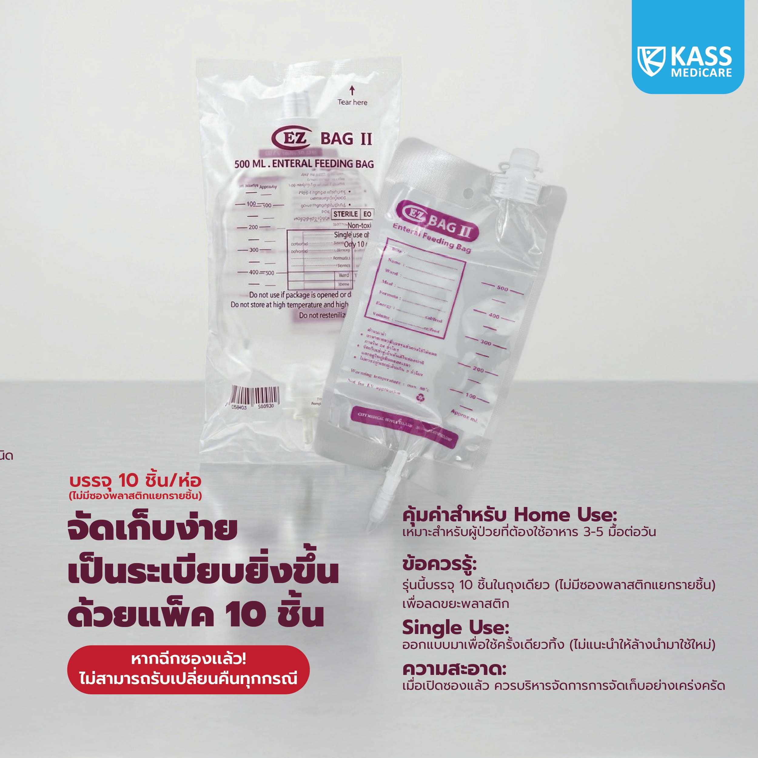 ถุงบรรรจุอาหารเหลว EZ Bag ถุงอาหารเหลว ขนาด 500 ML. ชนิดใช้ครั้งเดียวทิ้ง สำหรับบรรจุอาหารเหลวให้กับผู้ป่วยที่รับอาหารผ่านทางสายยาง ผลิตจากวัตถุดิบที่ปลอดภัยได้มาตรฐาน ผ่านการฆ่าเชื้อด้วยเอทธิลีนออกไซด์ (ETO) โดยมีระยะปลอดเชื้อ 5 ปี นับจากวันที่ผลิตหรือสิ้นสุดเมื่อบรรจุภัณฑ์ฉีกขาด บรรจุในซองพลาสติก HDPE ซองละ 10 ชิ้น สินค้าใช้ครั้งเดียวทิ้ง